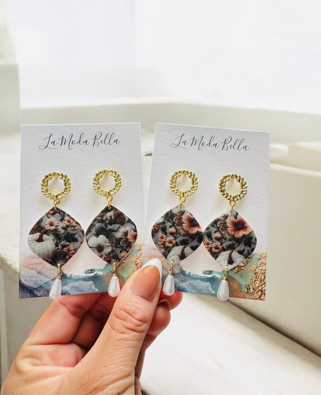 A soft blend of fall florals in warm orange and gray tones, finished with a gold rope hoop and delicate pearl drop. Elegant, feminine, and versatile. Perfect for both casual wear and special occasions.