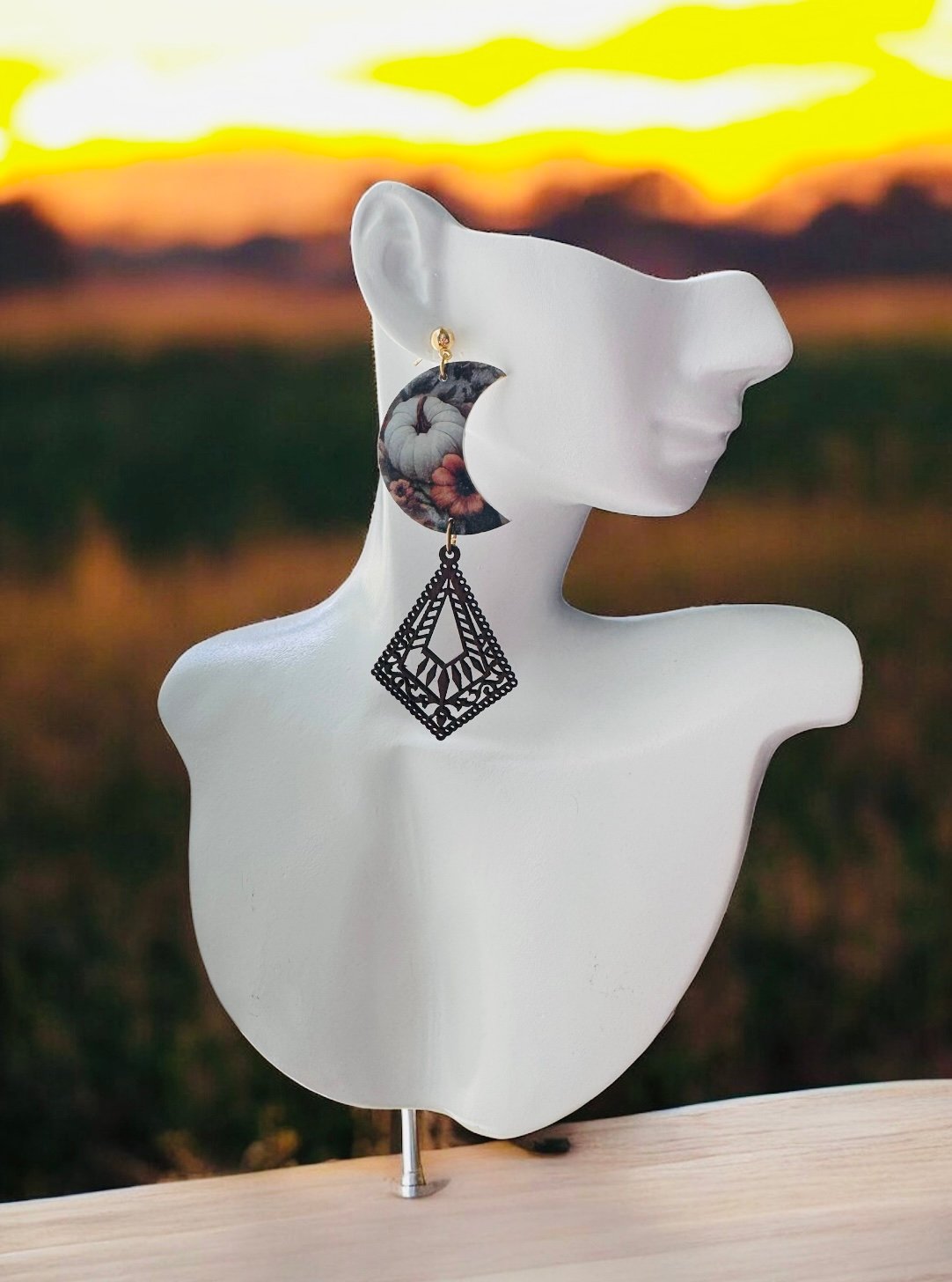 The Lunar Garden earrings combine celestial charm with bold design. A floral clay crescent moon is paired with a geometric wooden cut-out for a unique, handcrafted statement piece.