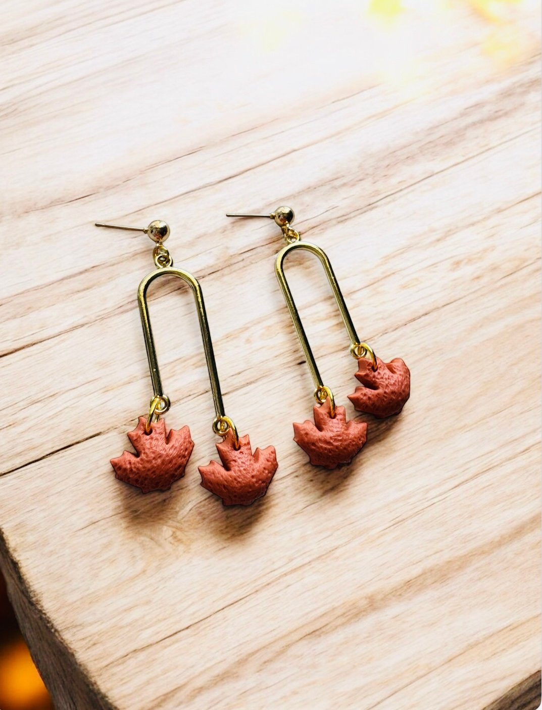 Minimal yet eye-catching, the Maple Arch earrings showcase gold arches with terracotta clay maple leaves. These lightweight handmade earrings capture autumn in its most subtle form.